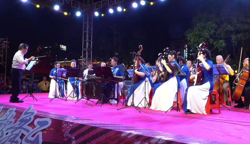 到了夜晚,重头戏“民间有高手”直播晚会闪亮登场。由阳朔当地业余爱好者组成的久久民乐队带来本次活动主题曲《山歌舞乐》,本地歌手利丽兴、王海林也先后登台献唱。
