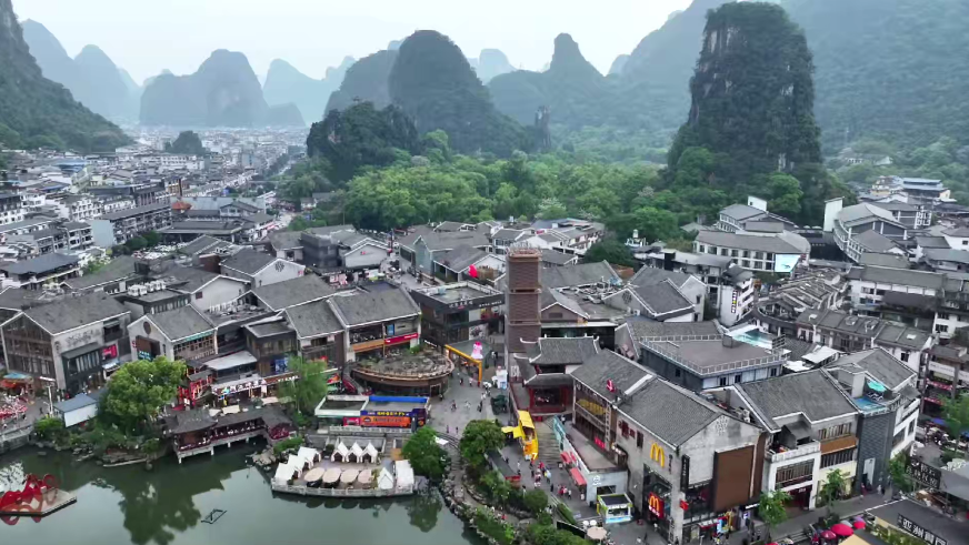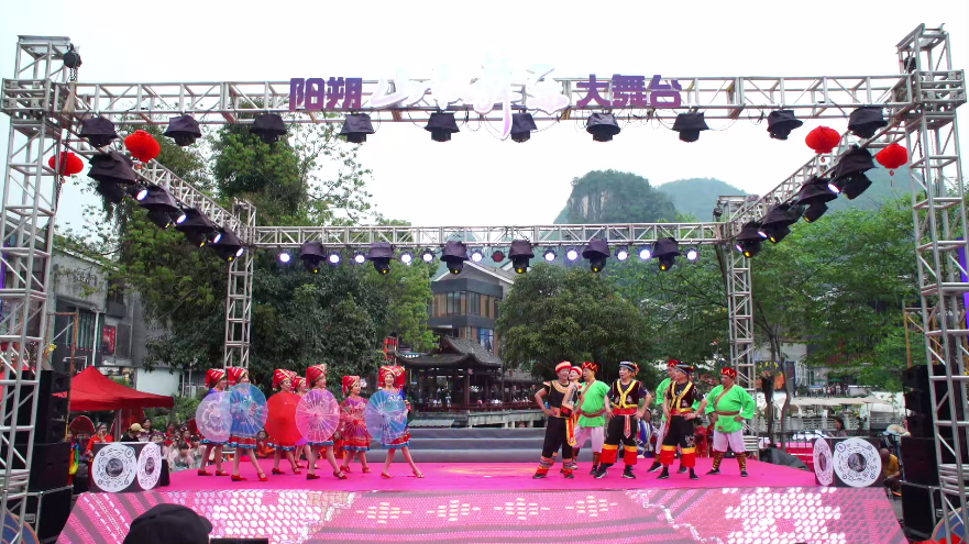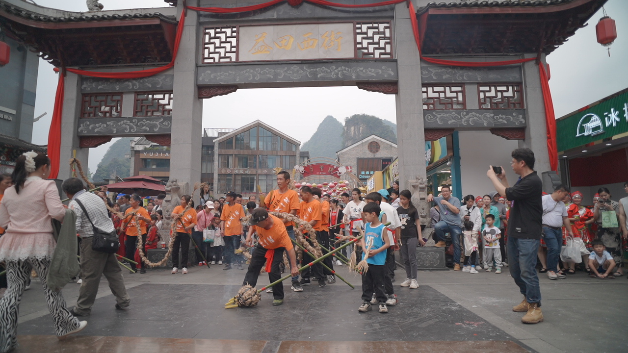 在阳朔西街益田牌楼门口广场的分舞台上,进行壮族传统民俗文化表演,阳朔传统稻草龙、竹竿舞、山歌对唱、非遗彩调,让远道而来的游客沉浸式体验壮乡风情。